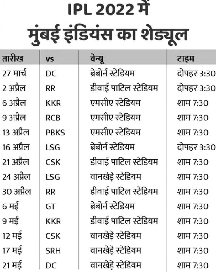 रिकॉर्ड 5 बार की चैंपियन मुंबई इंडियंस अपना पहला मुकाबला दिल्ली कैपिटल्स के खिलाफ ब्रेबोर्न स्टेडियम में खेलेगी। टीम में रोहित शर्मा के अलावा जसप्रीत बुमराह, कीरोन पोलार्ड, ईशान किशन और सूर्यकुमार यादव जैसे स्टार खिलाड़ी मौजूद हैं।